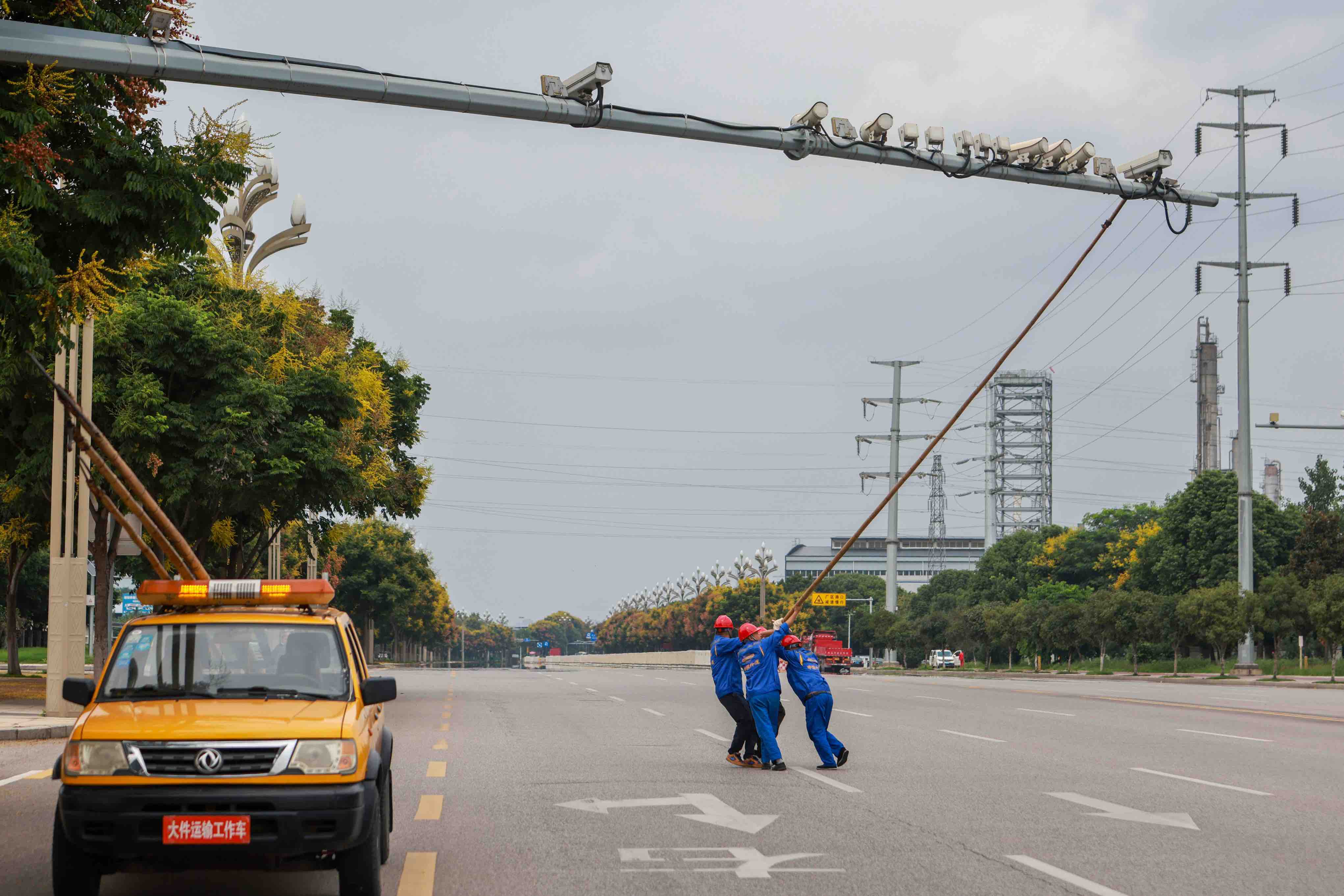 他們用自制工具將紅綠燈桿拉開,待車隊(duì)通過后,立即將燈桿拉正復(fù)位,避免影響交通。多年的“押鏢”,讓“鏢師”們配合默契,“這一路有多少個(gè)‘障礙’,我們都記在心里了?!必?fù)責(zé)排障的廖明丹說。