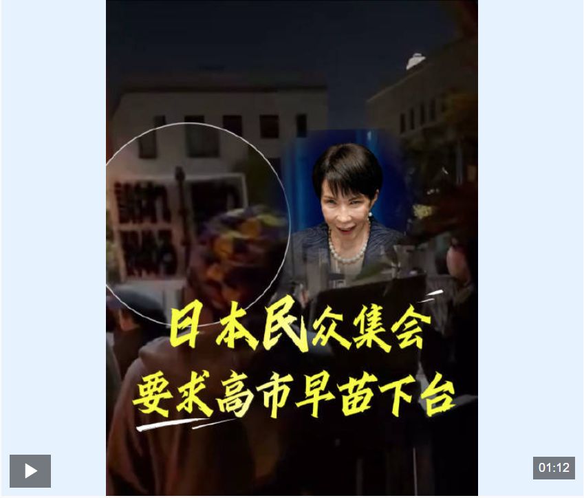 當地時間15日,上百名日本民眾在首相官邸前集會,抗議首相高市早苗涉華錯誤言行。高市早苗日前發(fā)表涉臺錯誤言論,公然鼓吹武力介入臺海,違背一個中國原則,引發(fā)中方嚴正抗議。其言論在日本國內也遭質疑和批評,多名議員、前首相及媒體要求其撤回言論,認為這加劇緊張關系,日本社會各界強調必須阻止危險政策。