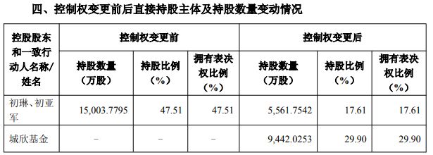 如本次股權轉讓順利實施,城欣基金將持有新亞強29.9%股份,成為公司控股股東。不過,初琳并未將其所持的股份全部轉讓——本次轉讓后,其仍持股16.09%;初琳及一致行動人初亞軍仍合計持股17.61%。