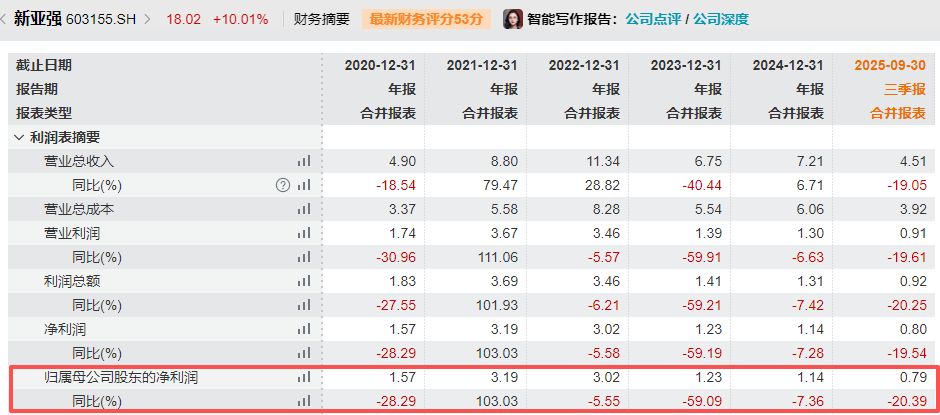 新亞強上市以來業(yè)績波動較大。2022年—2024年,公司的歸母凈利潤已經連續(xù)三個會計年度出現(xiàn)同比下滑。今年前三季度,新亞強營收同比下滑19.05%至4.51億元,歸母凈利潤同比下滑20.39%至0.79億元。