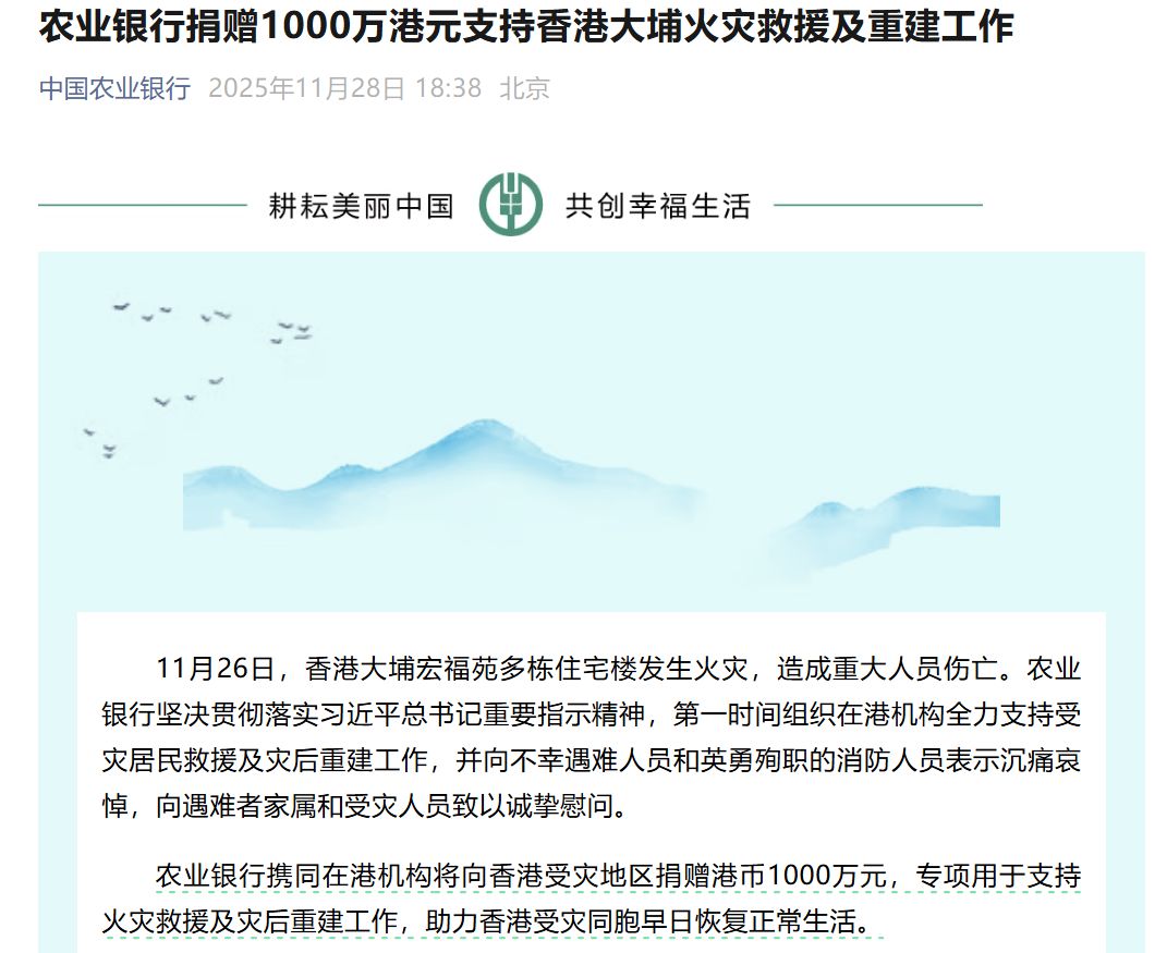 28日,農(nóng)業(yè)銀行稱,攜同在港機(jī)構(gòu)將向香港受災(zāi)地區(qū)捐贈(zèng)港幣1000萬(wàn)元,專項(xiàng)用于支持火災(zāi)救援及災(zāi)后重建工作,助力香港受災(zāi)同胞早日恢復(fù)正常生活。
