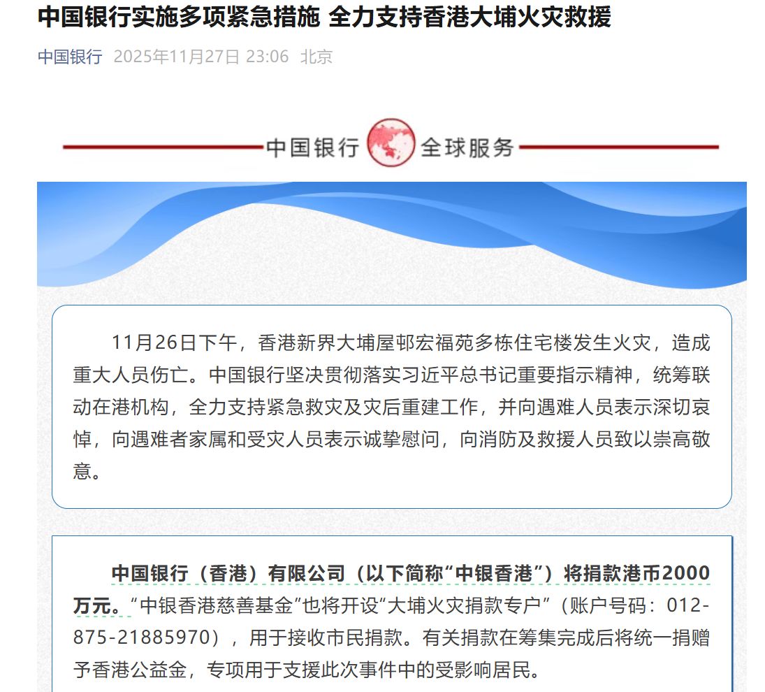27日,中國(guó)銀行發(fā)文稱,中國(guó)銀行(香港)有限公司(以下簡(jiǎn)稱“中銀香港”)將捐款港幣2000萬(wàn)元。“中銀香港慈善基金”也將開(kāi)設(shè)“大埔火災(zāi)捐款專戶”(賬戶號(hào)碼:012-875-21885970),用于接收市民捐款。有關(guān)捐款在籌集完成后將統(tǒng)一捐贈(zèng)予香港公益金,專項(xiàng)用于支援此次事件中的受影響居民。