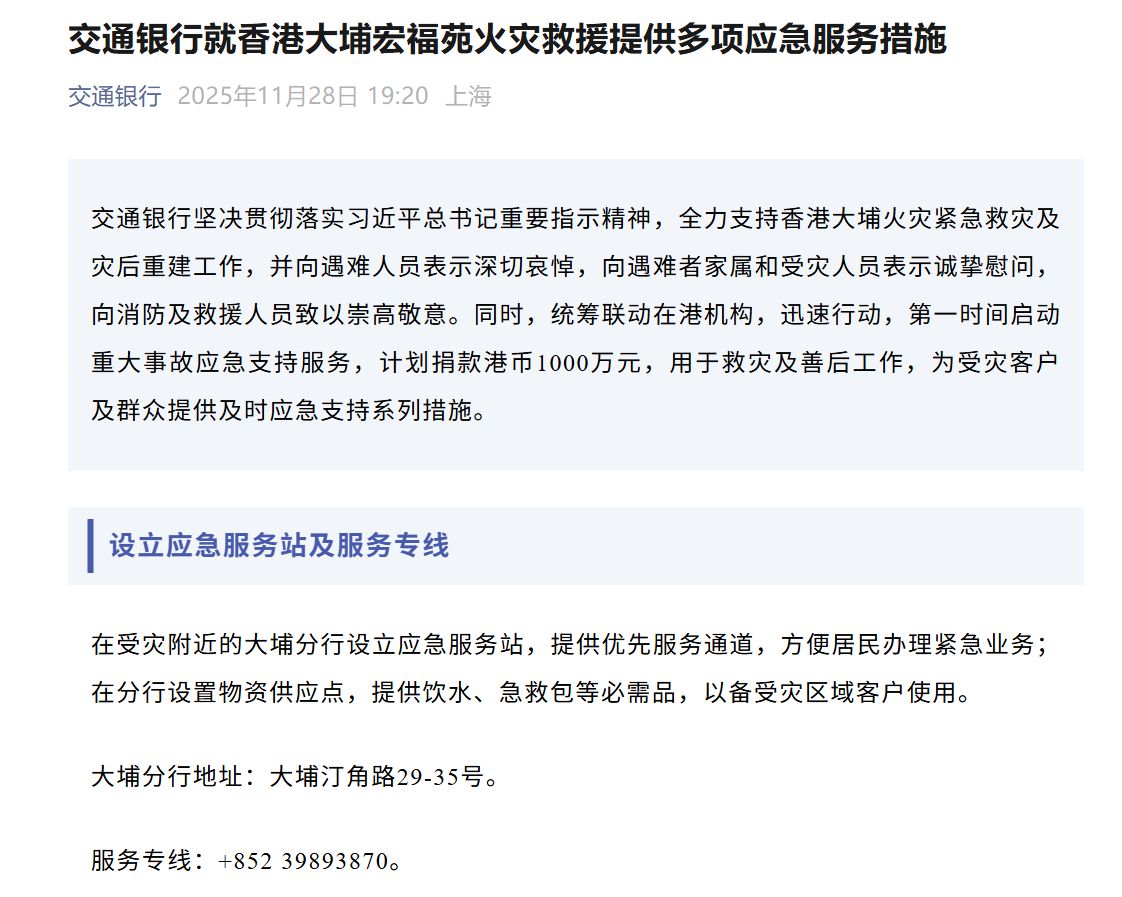 28日,交通銀行稱,計(jì)劃捐款港幣1000萬(wàn)元,用于救災(zāi)及善后工作,為受災(zāi)客戶及群眾提供及時(shí)應(yīng)急支持系列措施。