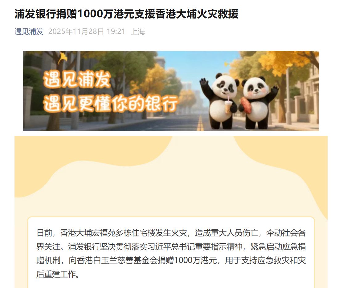 28日,浦發(fā)銀行發(fā)文表示,向香港白玉蘭慈善基金會(huì)捐贈(zèng)1000萬(wàn)港元,用于支持應(yīng)急救災(zāi)和災(zāi)后重建工作。