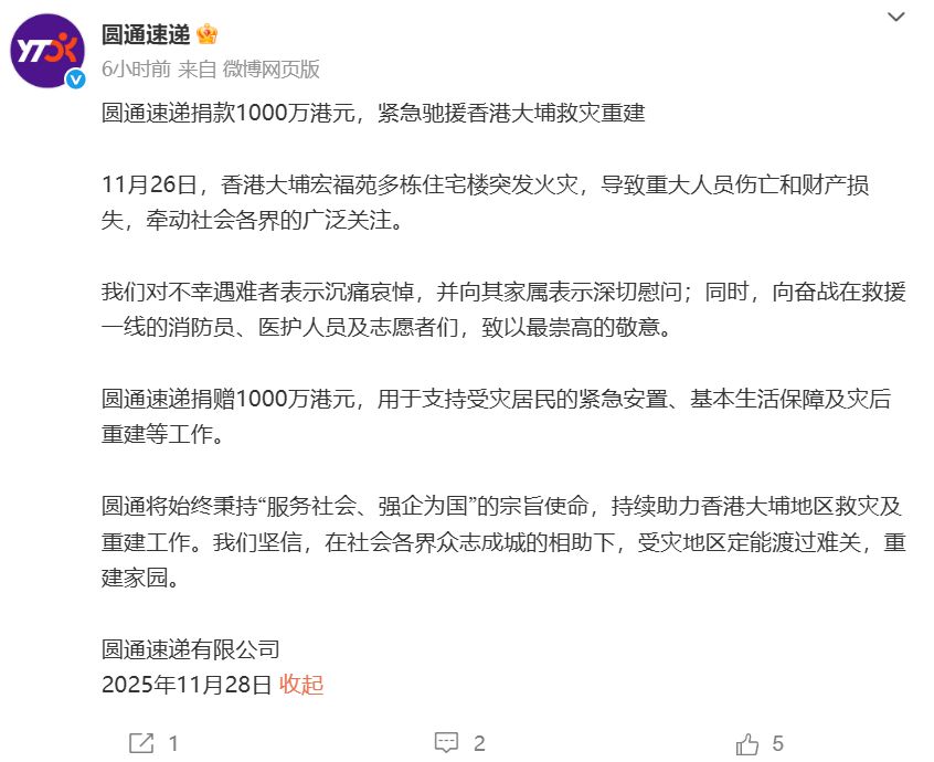 圓通速遞發(fā)文稱,11月26日,香港大埔宏福苑多棟住宅樓突發(fā)火災(zāi),導(dǎo)致重大人員傷亡和財(cái)產(chǎn)損失,牽動(dòng)社會(huì)各界的廣泛關(guān)注。