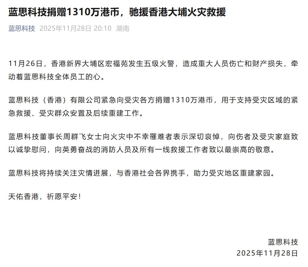 藍(lán)思科技捐贈(zèng)1310萬(wàn)港幣,馳援香港大埔火災(zāi)救援。