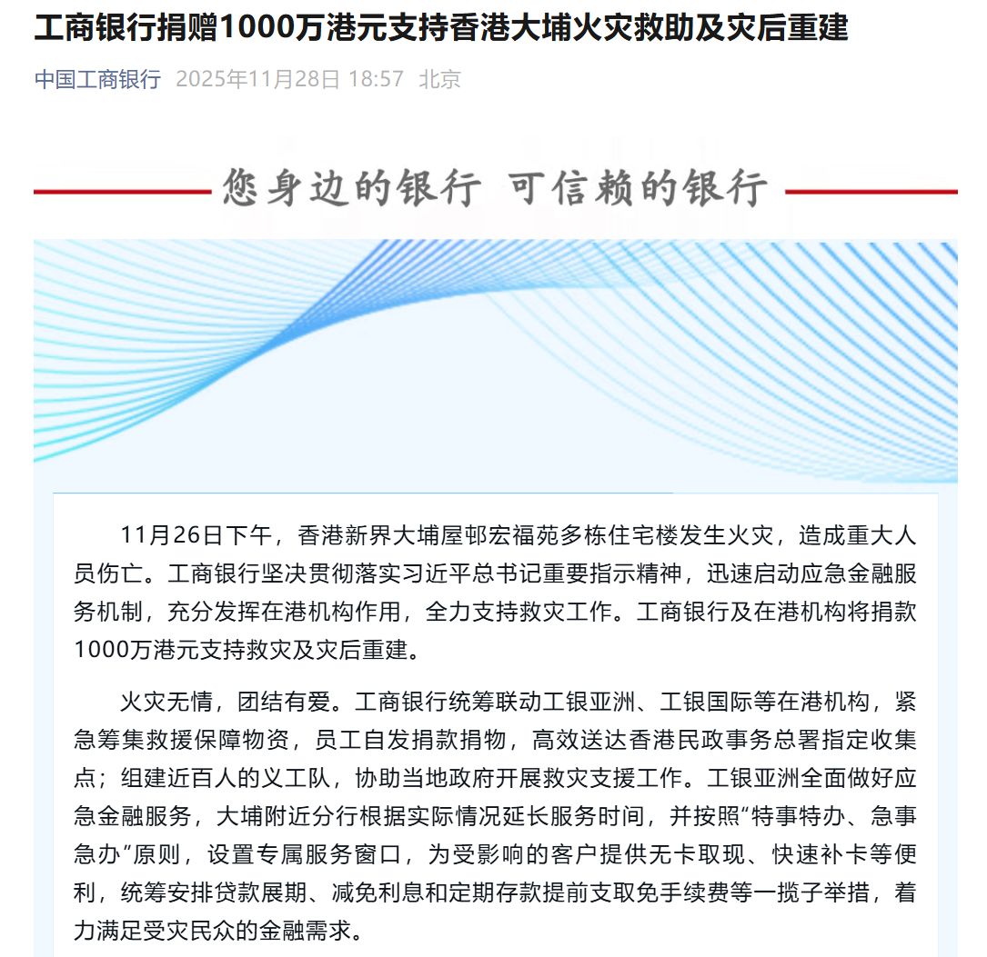 11月28日,工商銀行發(fā)文稱,工商銀行及在港機(jī)構(gòu)將捐款1000萬(wàn)港元支持救災(zāi)及災(zāi)后重建。