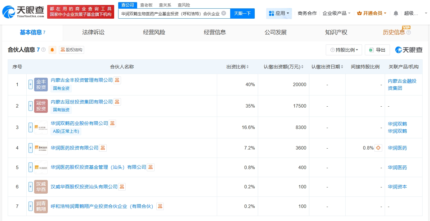 每經(jīng)AI快訊,天眼查工商信息顯示,近日,華潤雙鶴生物醫(yī)藥產(chǎn)業(yè)基金投資(呼和浩特)合伙企業(yè)(有限合伙)成立,執(zhí)行事務(wù)合伙人為華潤醫(yī)藥股權(quán)投資基金管理(汕頭)有限公司、漢威華酉股權(quán)投資汕頭有限公司,出資額5億元人民幣,經(jīng)營范圍包括以私募基金從事股權(quán)投資、投資管理、資產(chǎn)管理等活動。合伙人信息顯示,該基金由內(nèi)蒙古金豐投資管理有限公司、內(nèi)蒙古冠世投資集團(tuán)有限公司、華潤雙鶴(600062)等共同出資。