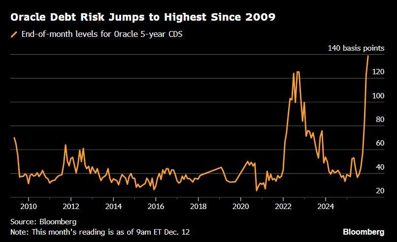 截至12月12日,甲骨文五年期信用違約掉期已升至2009年以來最高點(diǎn)