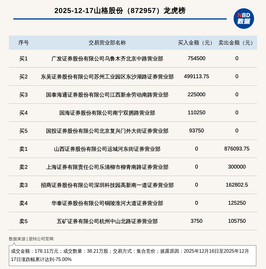 每經(jīng)訊,2025年12月17日,新三板創(chuàng)新層公司山格股份(872957,收盤價:3.75元)登上龍虎榜,交易方式是集合競價,披露原因是2025年12月16日至2025年12月17日漲跌幅累計達(dá)到-75.00%,成交數(shù)量38.21萬股,成交金額178.11萬元。買一席位為廣發(fā)證券股份有限公司烏魯木齊北京中路營業(yè)部,買入75.45萬元;賣一席位為山西證券股份有限公司運(yùn)城河?xùn)|街證券營業(yè)部,賣出87.61萬元。