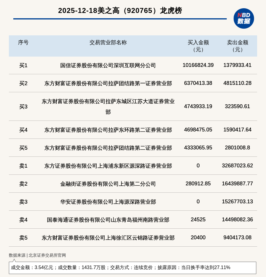 每經(jīng)訊,2025年12月18日,北交所上市公司美之高(920765,收盤價:26.1元)登上龍虎榜,交易方式是連續(xù)競價,披露原因是當日換手率達到27.11%,成交數(shù)量1431.7萬股,成交金額3.54億元。買一席位為國信證券股份有限公司深圳互聯(lián)網(wǎng)分公司,買入1016.68萬元;賣一席位為東方證券股份有限公司上海浦東新區(qū)源深路證券營業(yè)部,賣出3268.7萬元。