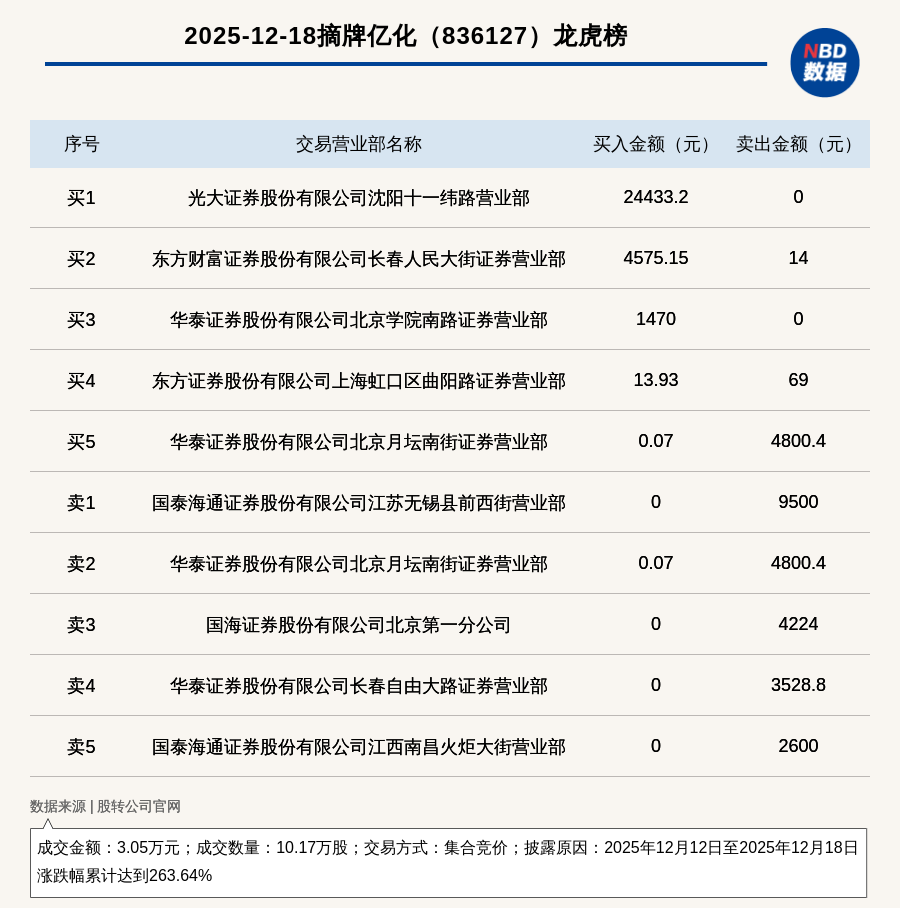 每經(jīng)訊,2025年12月18日,新三板基礎(chǔ)層公司摘牌億化(836127,收盤價:0.4元)登上龍虎榜,交易方式是集合競價,披露原因是2025年12月12日至2025年12月18日漲跌幅累計達(dá)到263.64%,成交數(shù)量10.17萬股,成交金額3.05萬元。買一席位為光大證券股份有限公司沈陽十一緯路營業(yè)部,買入2.44萬元;賣一席位為國泰海通證券股份有限公司江蘇無錫縣前西街營業(yè)部,賣出9500元。