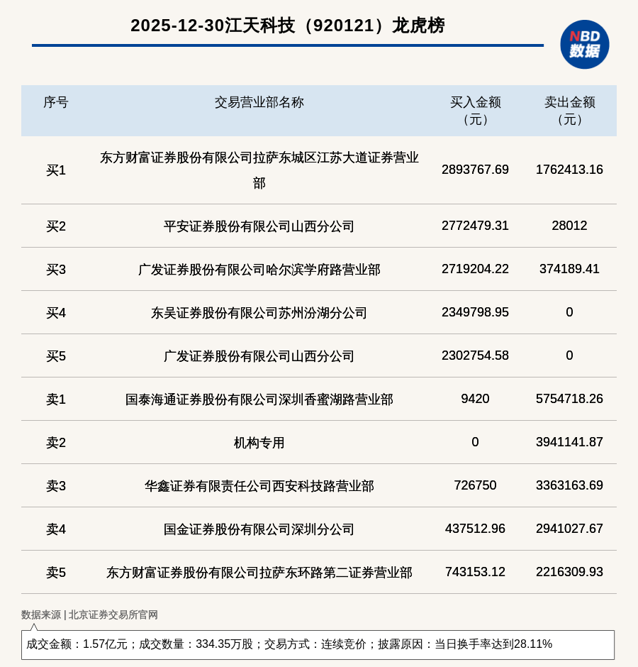 每經(jīng)訊,2025年12月30日,北交所上市公司江天科技(920121,收盤價:46.14元)登上龍虎榜,交易方式是連續(xù)競價,披露原因是當日換手率達到28.11%,成交數(shù)量334.35萬股,成交金額1.57億元。買一席位為東方財富證券股份有限公司拉薩東城區(qū)江蘇大道證券營業(yè)部,買入289.38萬元;賣一席位為國泰海通證券股份有限公司深圳香蜜湖路營業(yè)部,賣出575.47萬元。