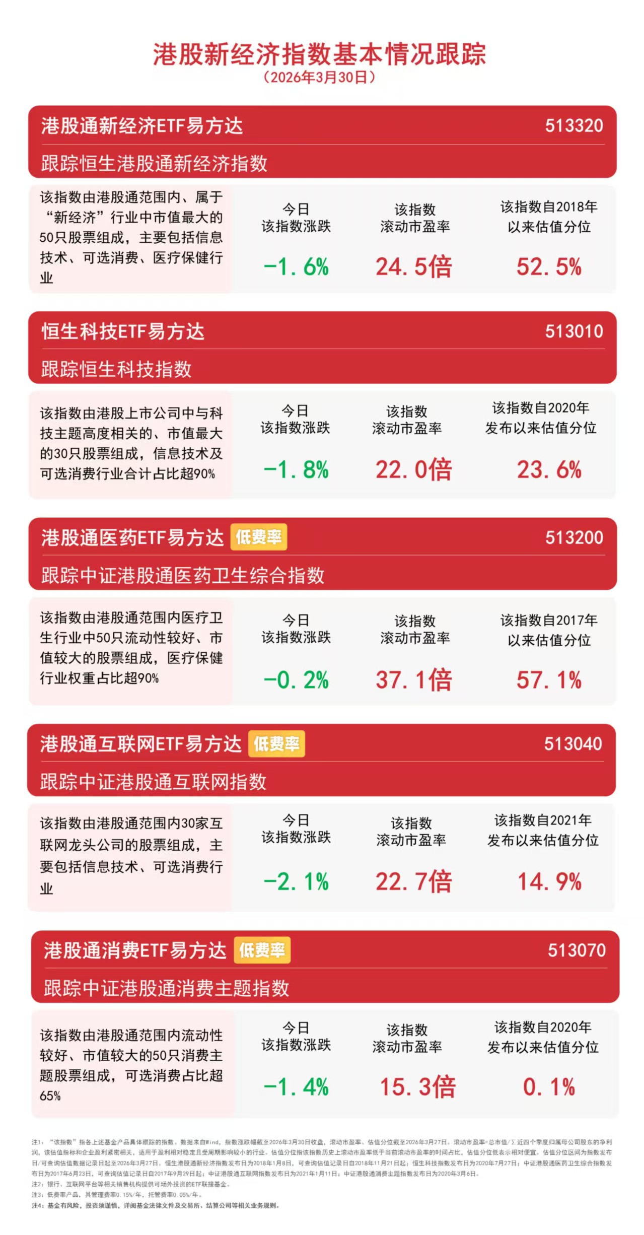 截至收盤,中證港股通醫(yī)藥衛(wèi)生綜合指數(shù)下跌0.2%,中證港股通消費主題指數(shù)下跌1.4%,恒生港股通新經(jīng)濟指數(shù)下跌1.6%,恒生科技指數(shù)下跌1.8%,中證港股通互聯(lián)網(wǎng)指數(shù)下跌2.1%。Wind數(shù)據(jù)顯示,截至上周五,恒生科技ETF易方達(513010,聯(lián)接基金A/C:013308/013309)近一月“吸金”超20億元。