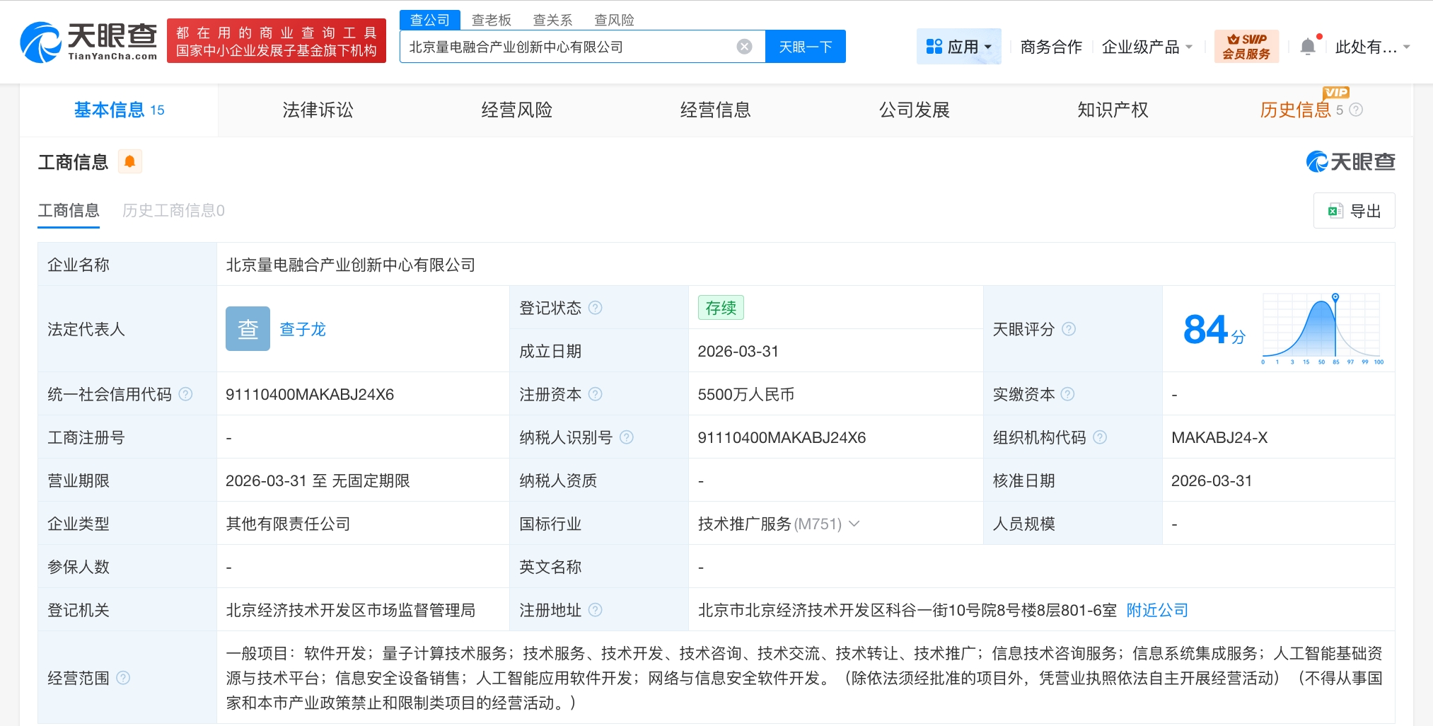 每經(jīng)AI快訊,天眼查工商信息顯示,近日,北京量電融合產(chǎn)業(yè)創(chuàng)新中心有限公司成立,法定代表人為查子龍,注冊(cè)資本5500萬(wàn)元人民幣,經(jīng)營(yíng)范圍含軟件開(kāi)發(fā)、量子計(jì)算技術(shù)服務(wù)、信息技術(shù)咨詢服務(wù)、信息系統(tǒng)集成服務(wù)、人工智能基礎(chǔ)資源與技術(shù)平臺(tái)、信息安全設(shè)備銷售、人工智能應(yīng)用軟件開(kāi)發(fā)等。股東信息顯示,該公司由中電信量子信息科技集團(tuán)有限公司、北京通明湖信息城發(fā)展有限公司、中興通訊(000063)等共同持股。