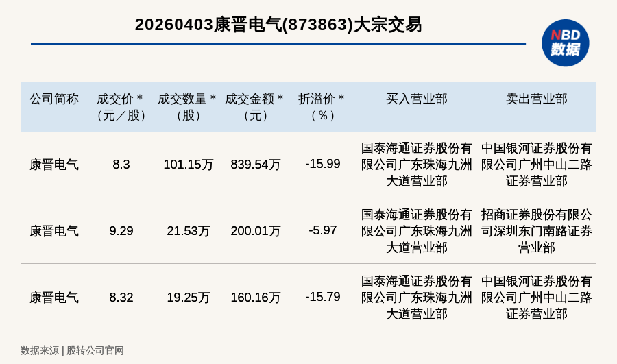 每經(jīng)訊,2026年4月3日,新三板創(chuàng)新層公司康晉電氣(873863,收盤價(jià):9.88元)發(fā)生3筆大宗交易,總成交金額為1199.72萬元,成交金額最高的一筆成交價(jià)8.3元/股,成交數(shù)量101.15萬股,成交金額839.54萬元,折價(jià)15.99%。買入營業(yè)部是國泰海通證券股份有限公司廣東珠海九洲大道營業(yè)部,賣出營業(yè)部是中國銀河證券股份有限公司廣州中山二路證券營業(yè)部。