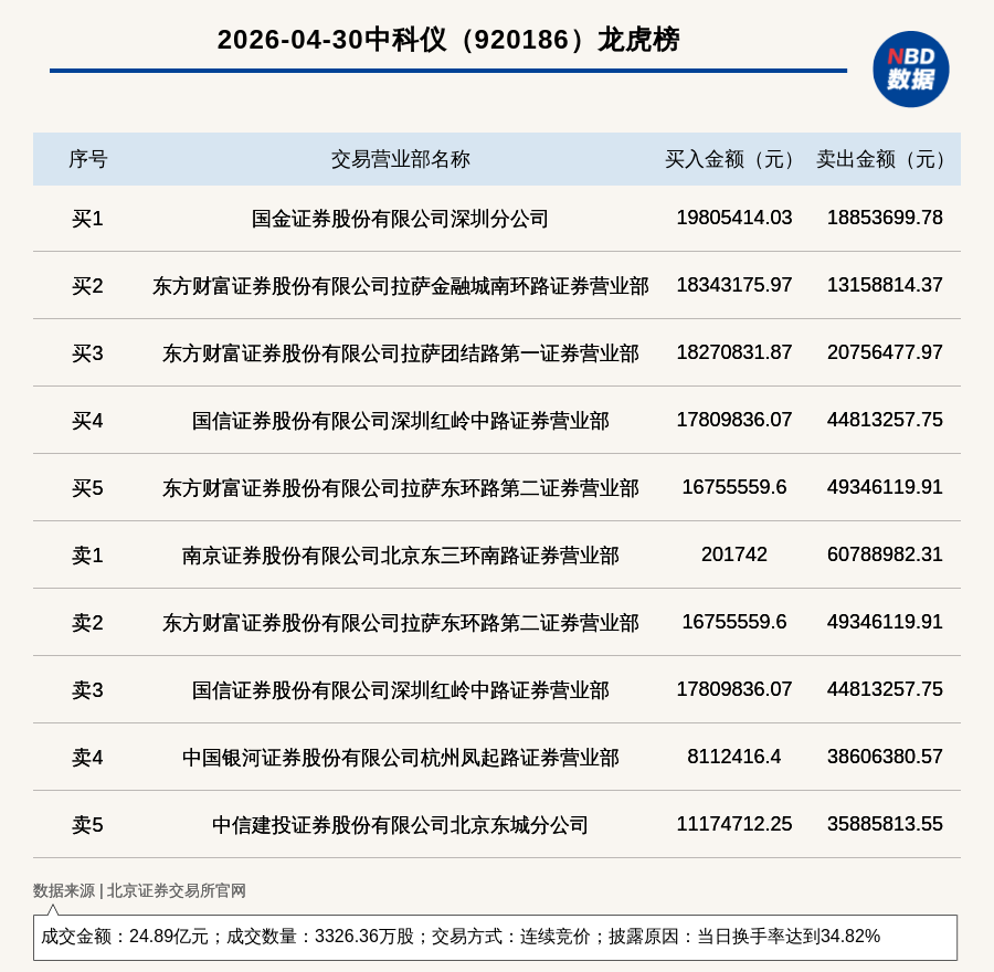 每經(jīng)訊,2026年4月30日,北交所上市公司中科儀(920186,收盤價:76.4元)登上龍虎榜,交易方式是連續(xù)競價,披露原因是當日換手率達到34.82%,成交數(shù)量3326.36萬股,成交金額24.89億元。買一席位為國金證券股份有限公司深圳分公司,買入1980.54萬元;賣一席位為南京證券股份有限公司北京東三環(huán)南路證券營業(yè)部,賣出6078.9萬元。