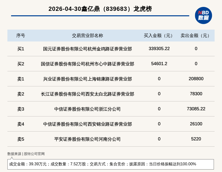 每經(jīng)訊,2026年4月30日,新三板基礎(chǔ)層公司鑫億鼎(839683,收盤價(jià):10.44元)登上龍虎榜,交易方式是集合競(jìng)價(jià),披露原因是當(dāng)日價(jià)格振幅達(dá)到100.00%,成交數(shù)量7.52萬股,成交金額39.39萬元。買一席位為國(guó)元證券股份有限公司杭州金雞路證券營(yíng)業(yè)部,買入33.93萬元;賣一席位為興業(yè)證券股份有限公司上海錦康路證券營(yíng)業(yè)部,賣出20.88萬元。